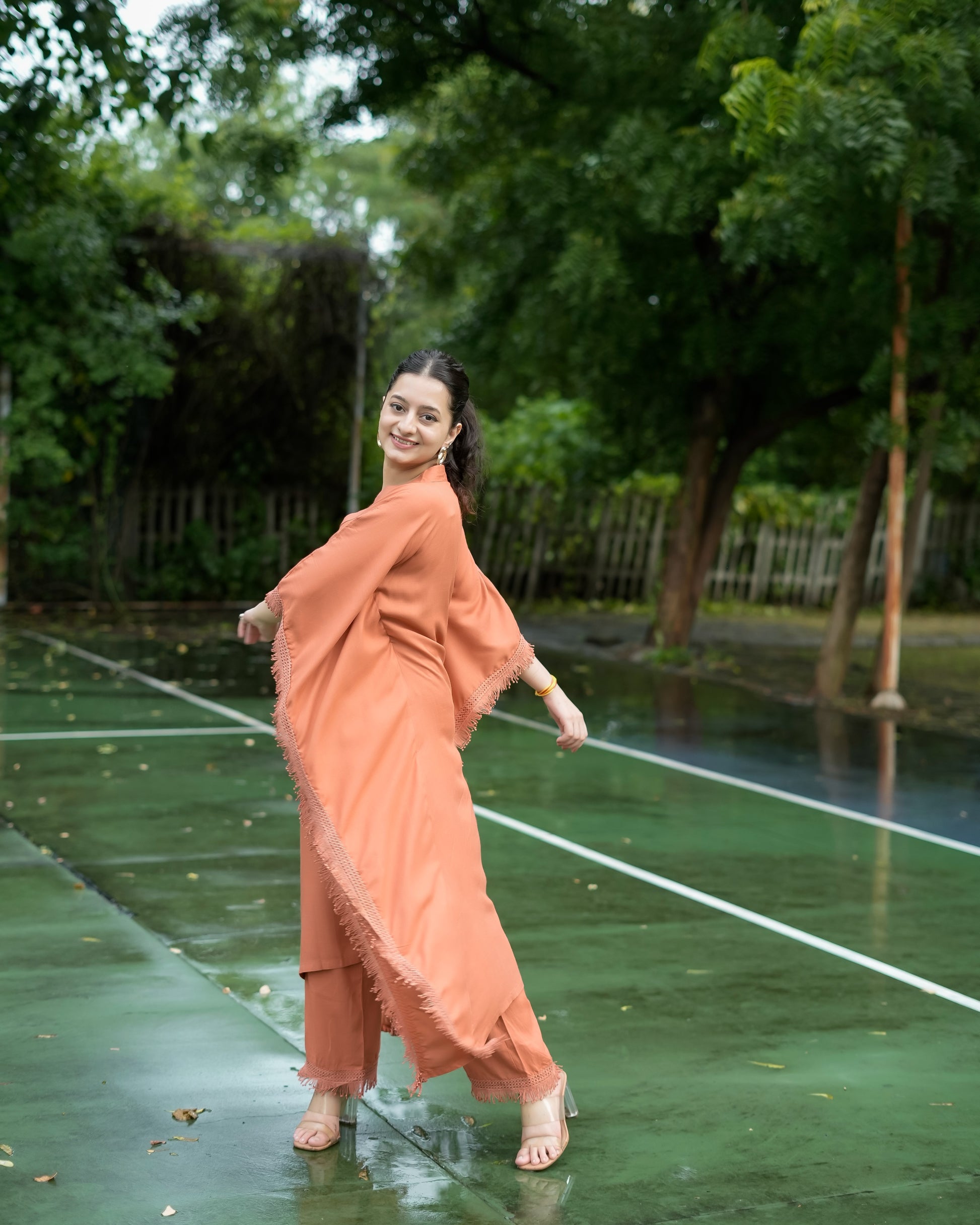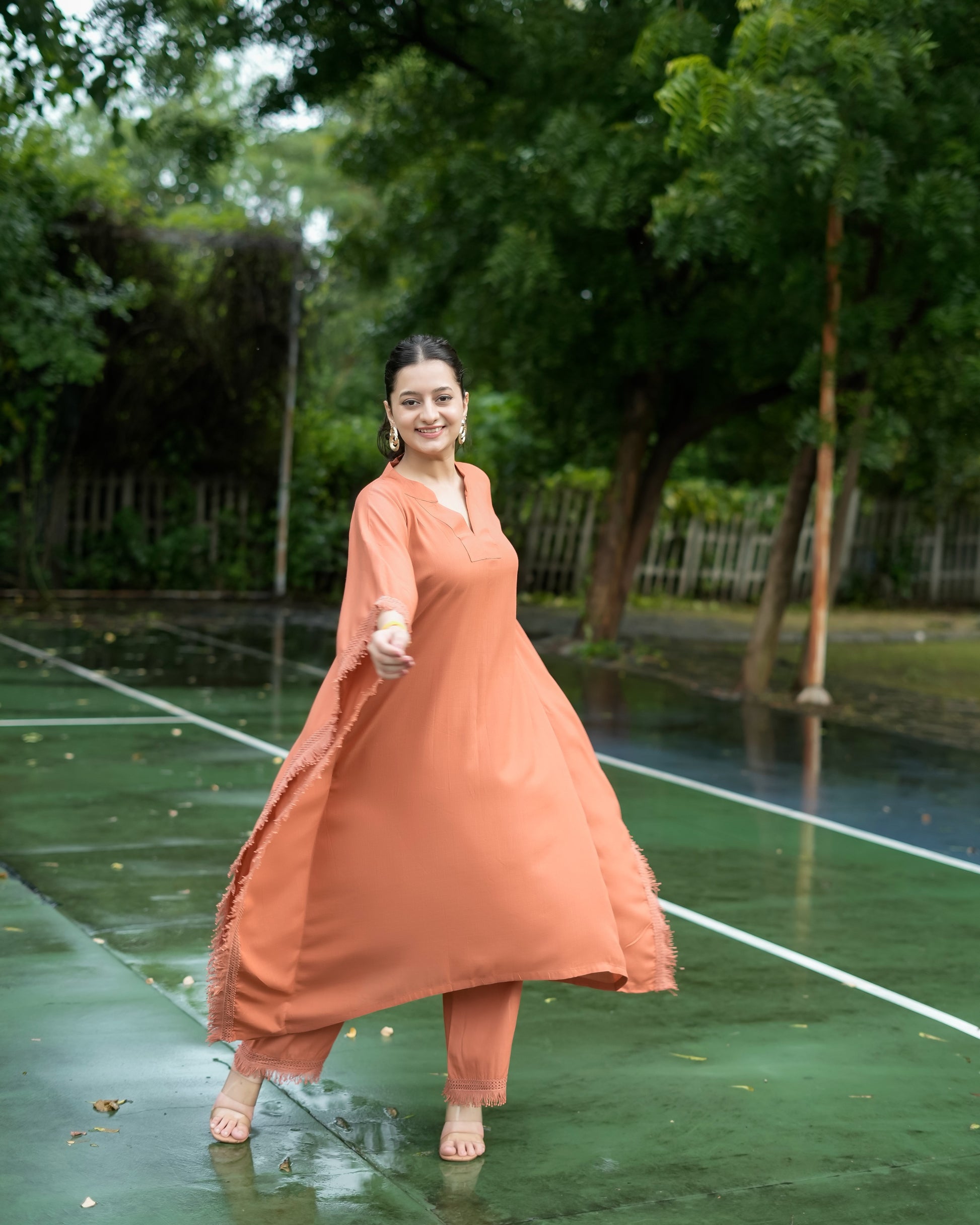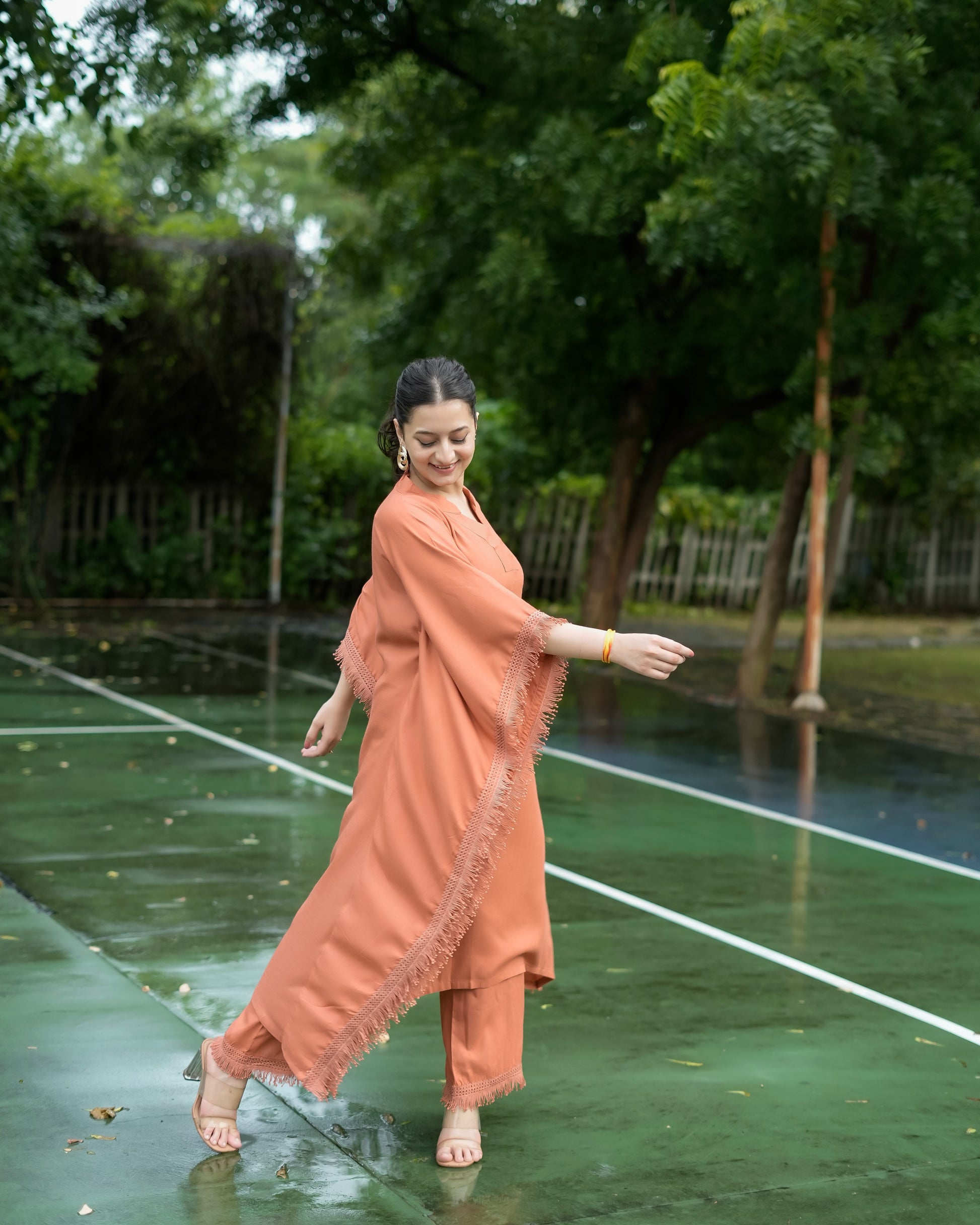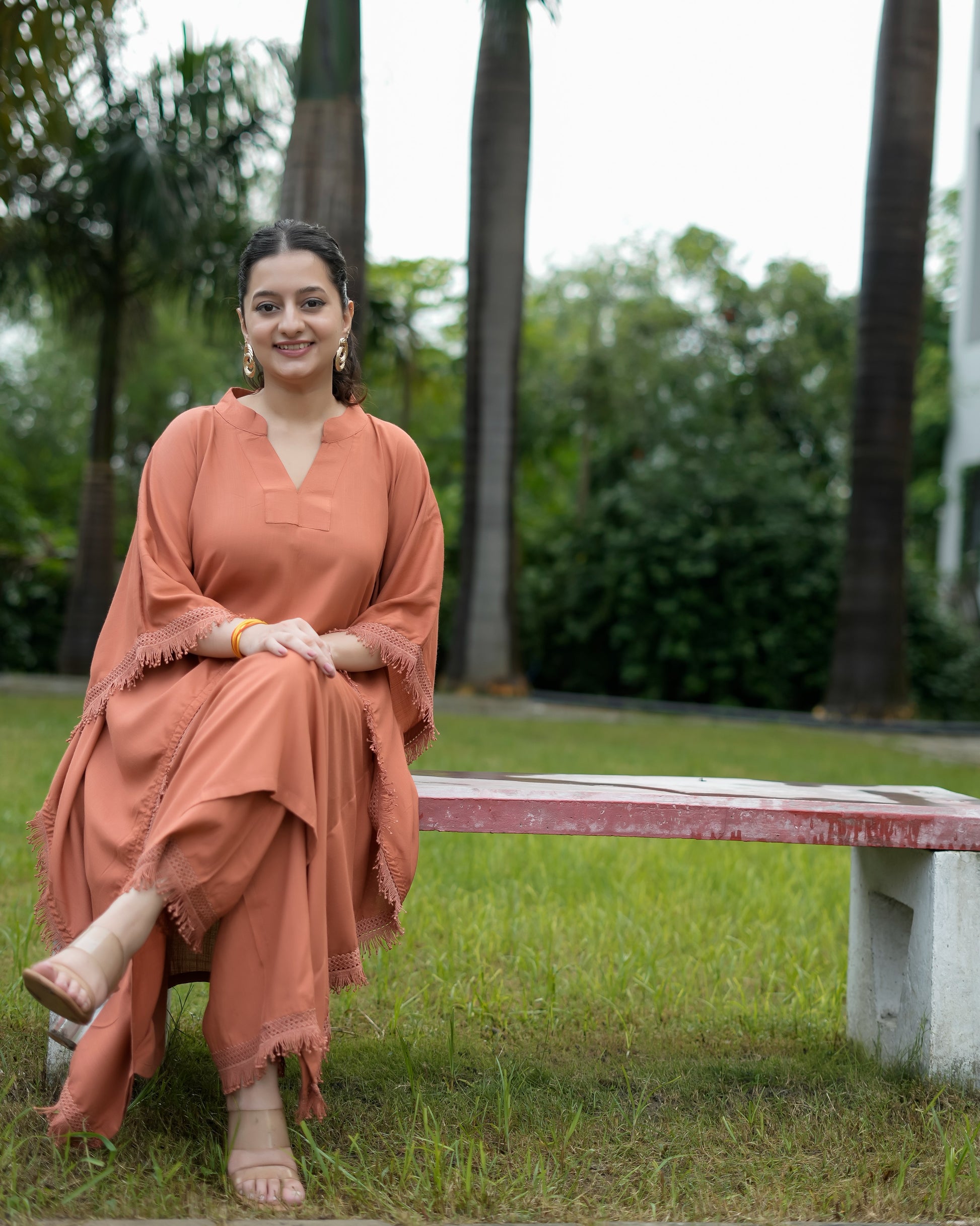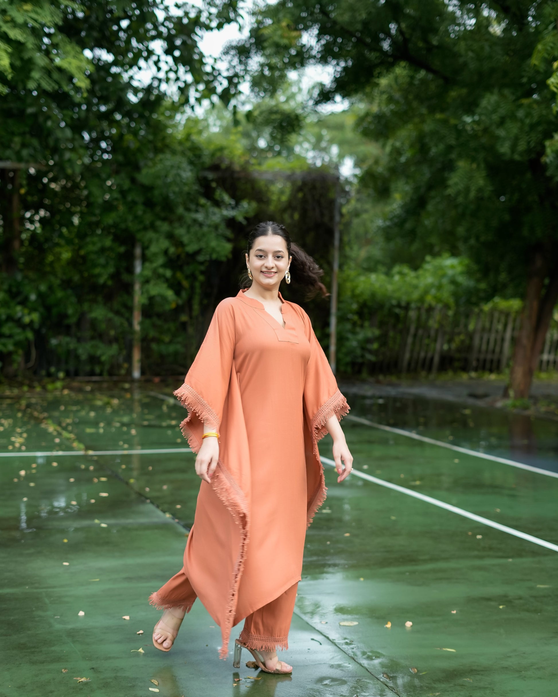 Drape yourself in effortless charm with दिशा’s Sienna Brown Kaftan Set — where comfort meets quiet luxury. Made from soft, breathable rayon fabric, this set is your perfect match for the summer season, keeping you cool, comfy, and stylish all day long. The flowy kaftan features a flattering V-neckline and is adorned with intricate lace detailing, adding just the right amount of elegance to this minimal beauty. Paired with matching plazo pants (with pockets, of course!), it brings together comfort and grace in the most beautiful way. The solid sienna brown hue might be simple, but its richness and the refined detailing give off a luxury vibe without the fuss. Whether you're lounging at home, heading to a casual brunch, or attending a low-key gathering, this set has your back — literally and fashionably.