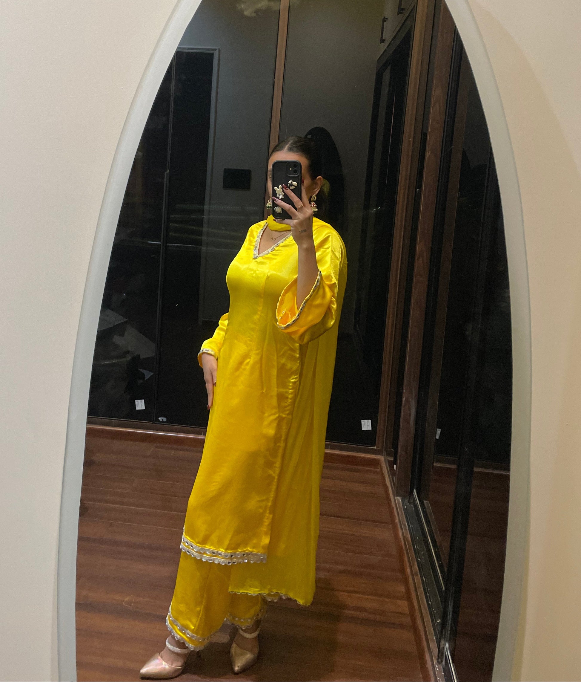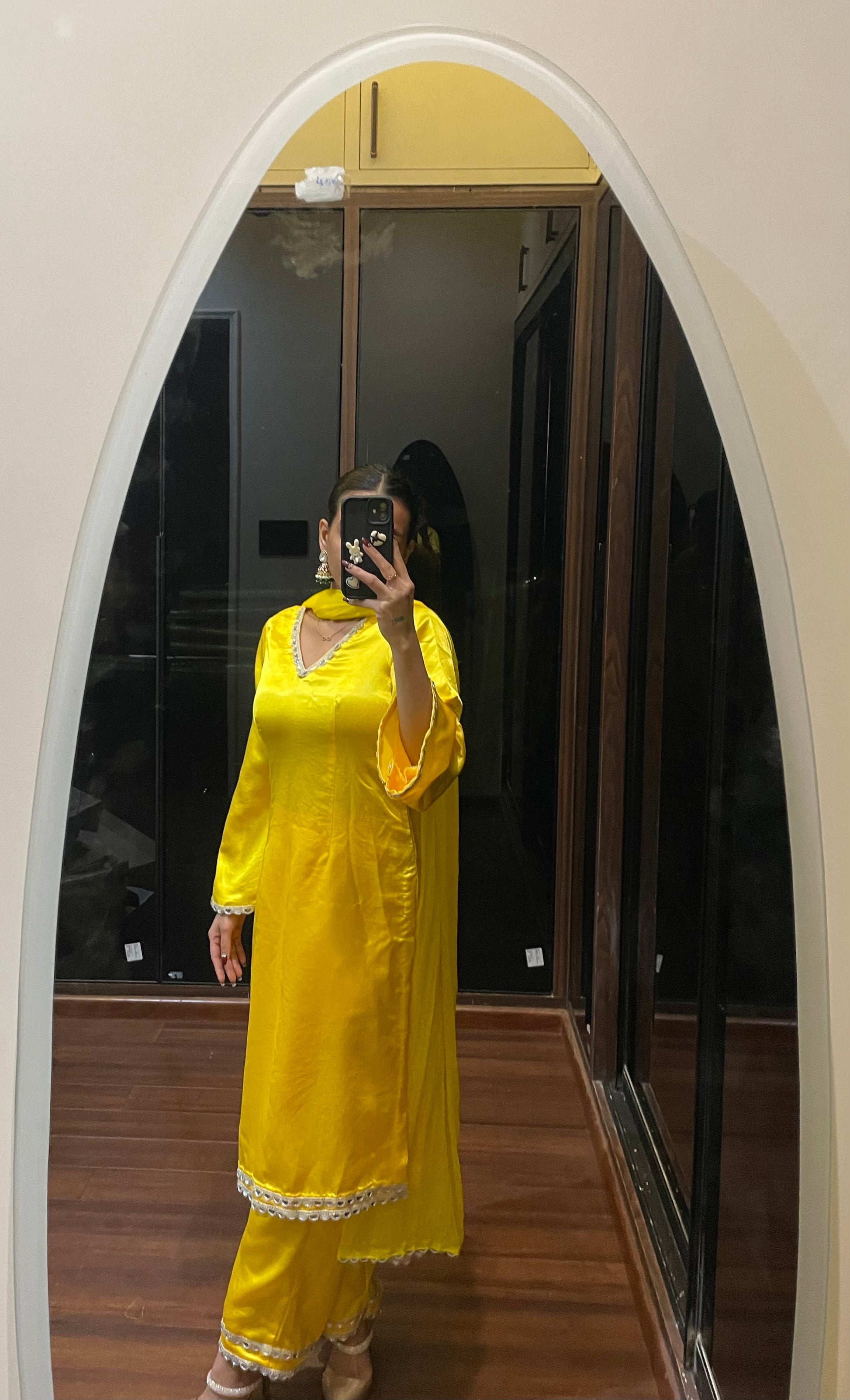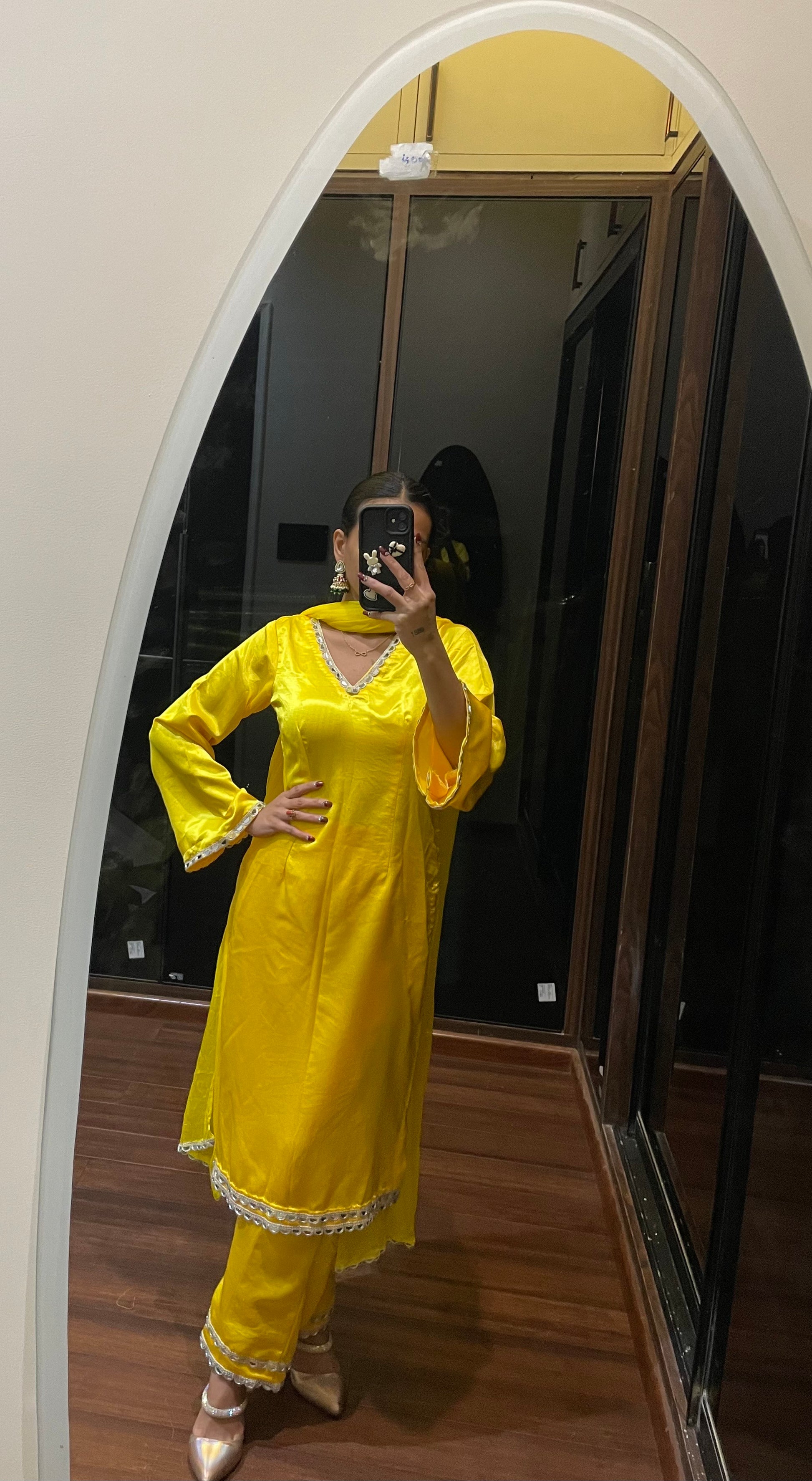 Glow like sunshine in दिशा's A-line Yellow Kurta Set — a radiant blend of tradition and trend that’s made to make memories. Crafted from lustrous satin fabric, this A-line beauty features delicate mirror work detailing all over, adding just the right touch of sparkle to your every move. Paired with a soft chiffon dupatta, it flows effortlessly with grace and charm. Whether you're twirling at a haldi celebration or lighting up a festive occasion, this outfit is your go-to for a look that’s unforgettable, elegant, and full of joy. Breathable, durable, and always in style — it’s everything you need to slay the season in style.