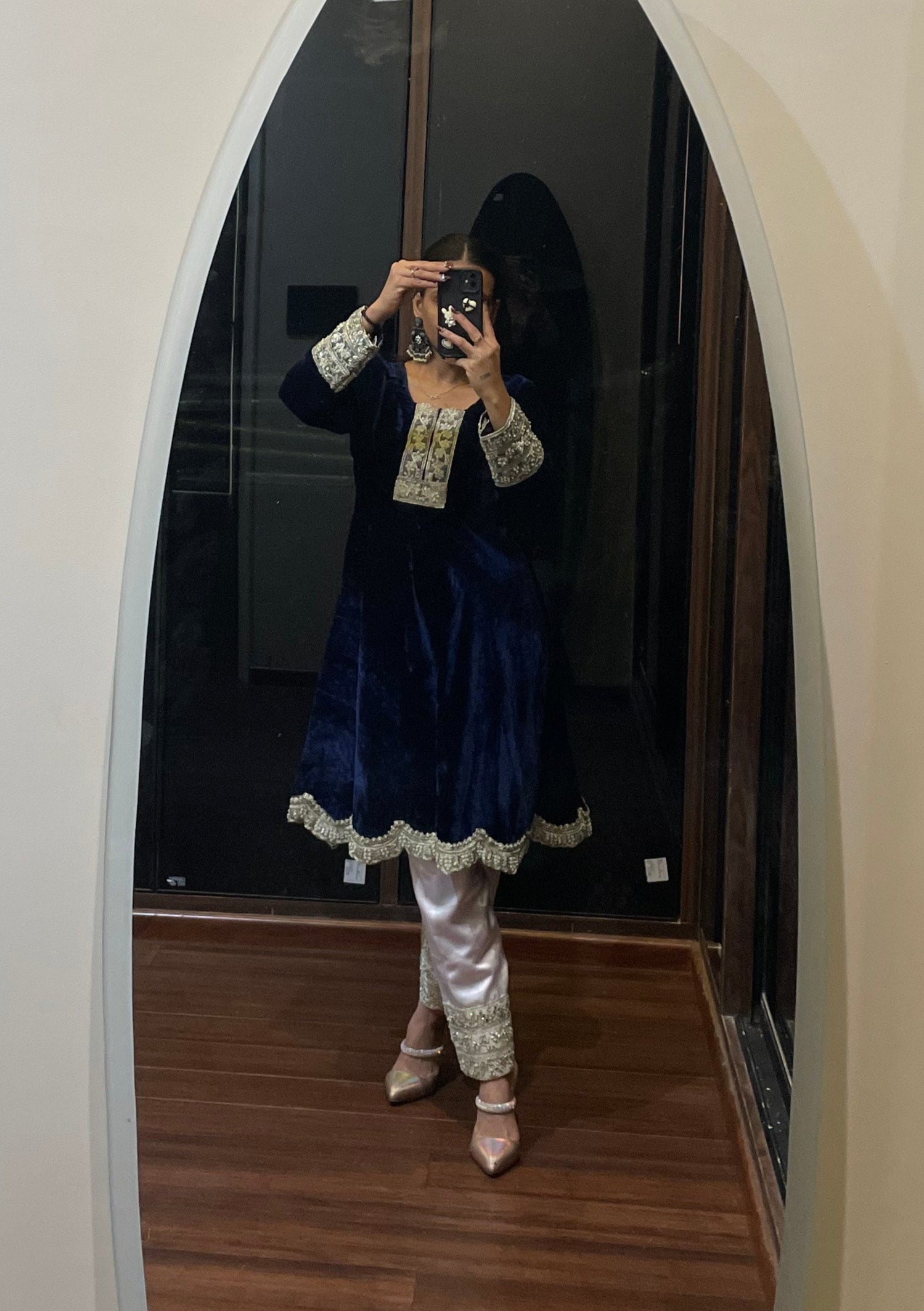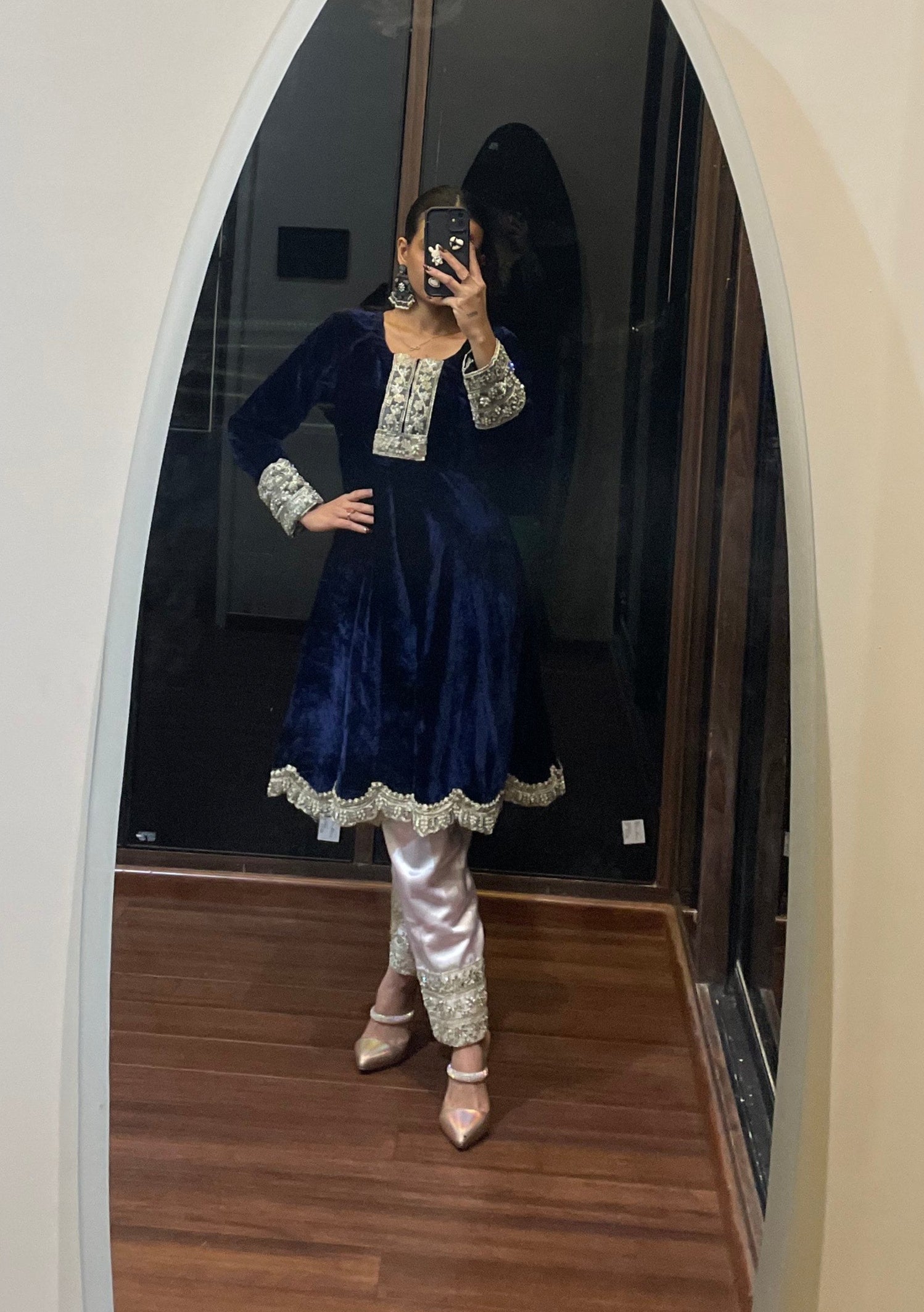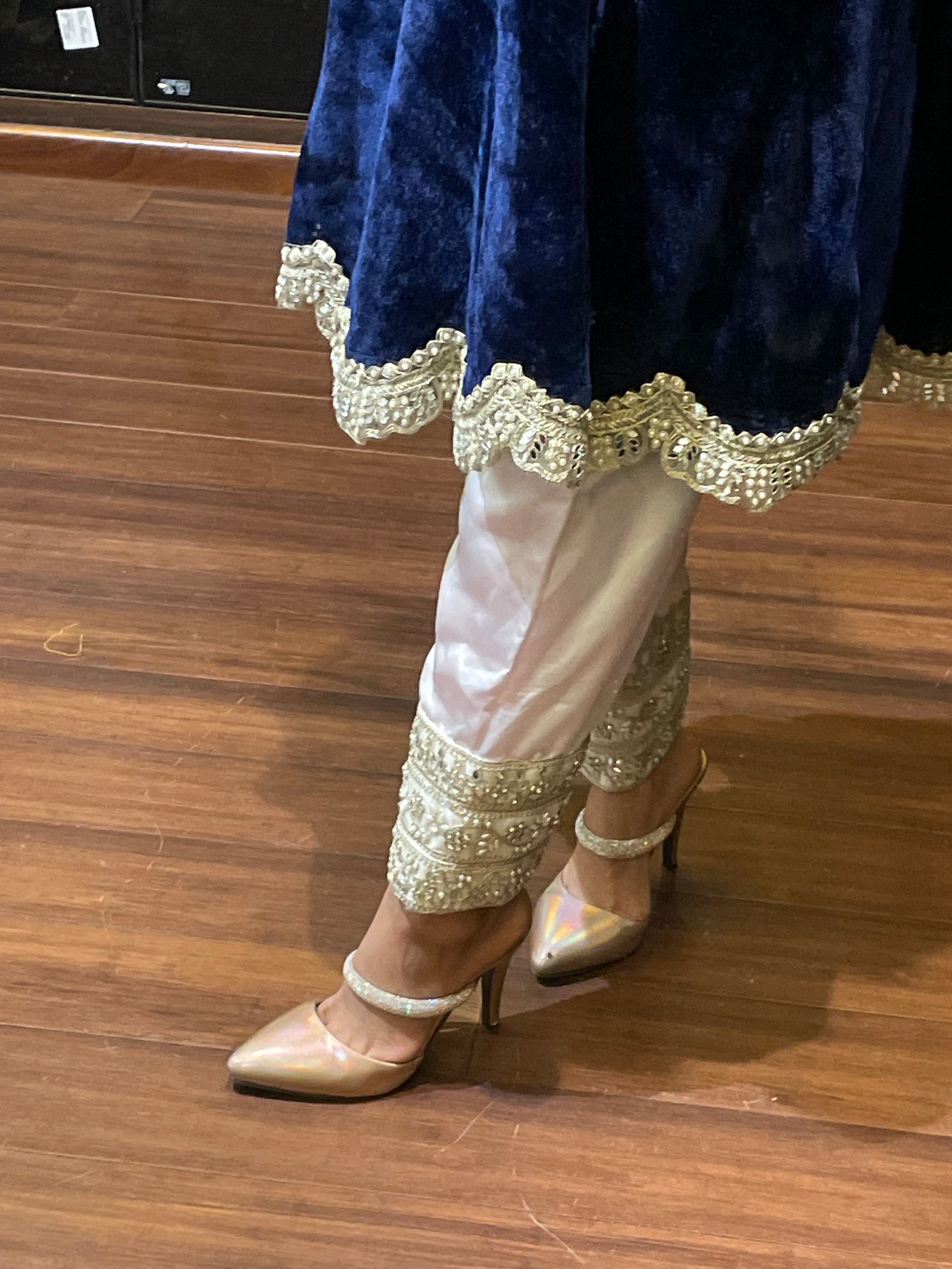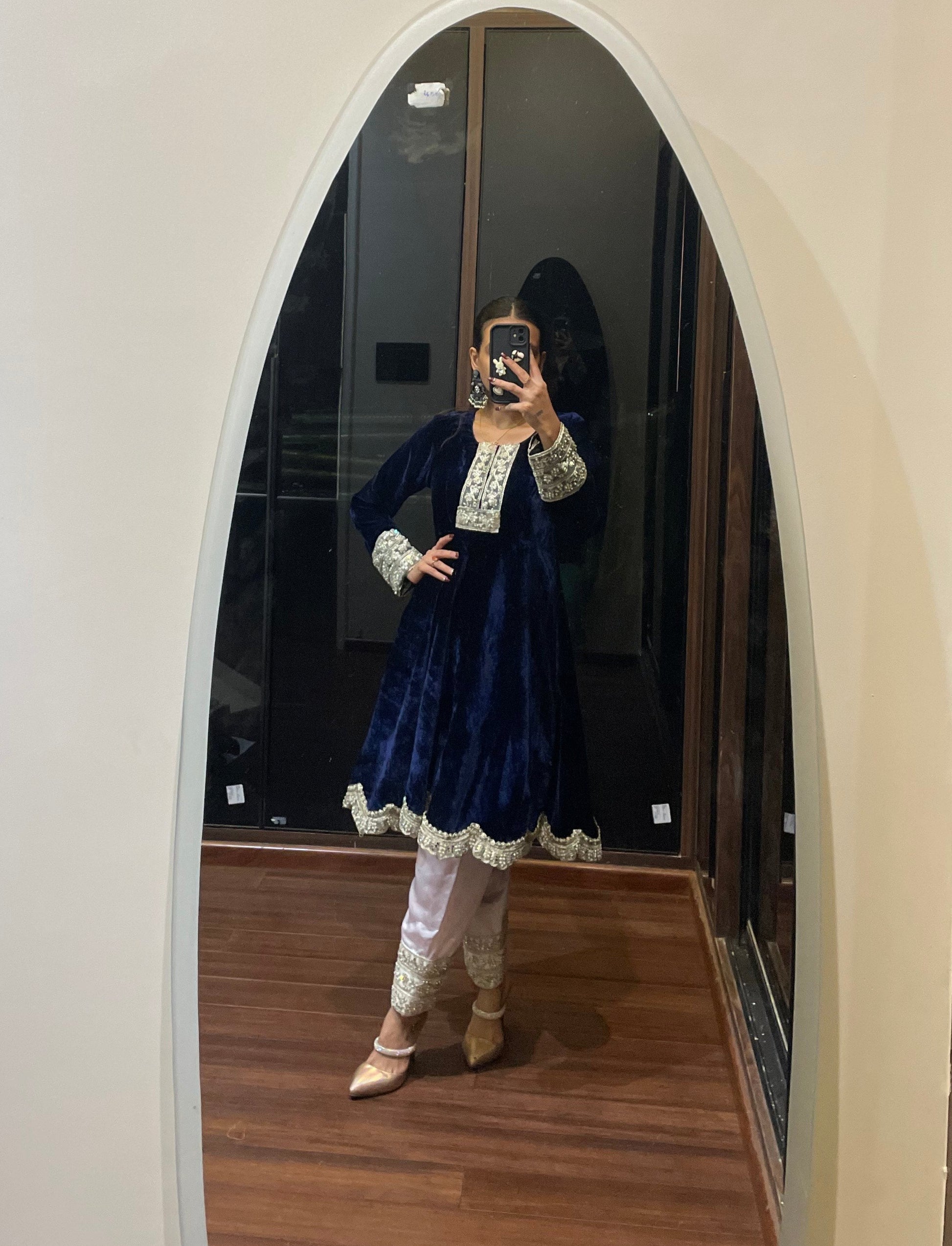 Step into royalty with दिशा's Indigo Velvet Suit – where elegance meets affordability in the most graceful way. Crafted with rich velvet fabric for the kurta and smooth satin for the salwar, this set feels as luxurious as it looks. The full-sleeve kurta is adorned with intricate mirror work detailing, adding a hint of sparkle and a whole lot of regal charm. Perfect for festive nights, winter weddings, or any celebration that calls for a little glam, this suit brings premium feel without the premium price – because you deserve to look like royalty without breaking the bank. Classy, royal, and oh-so-beautiful – दिशा’s got your back (and your budget)!