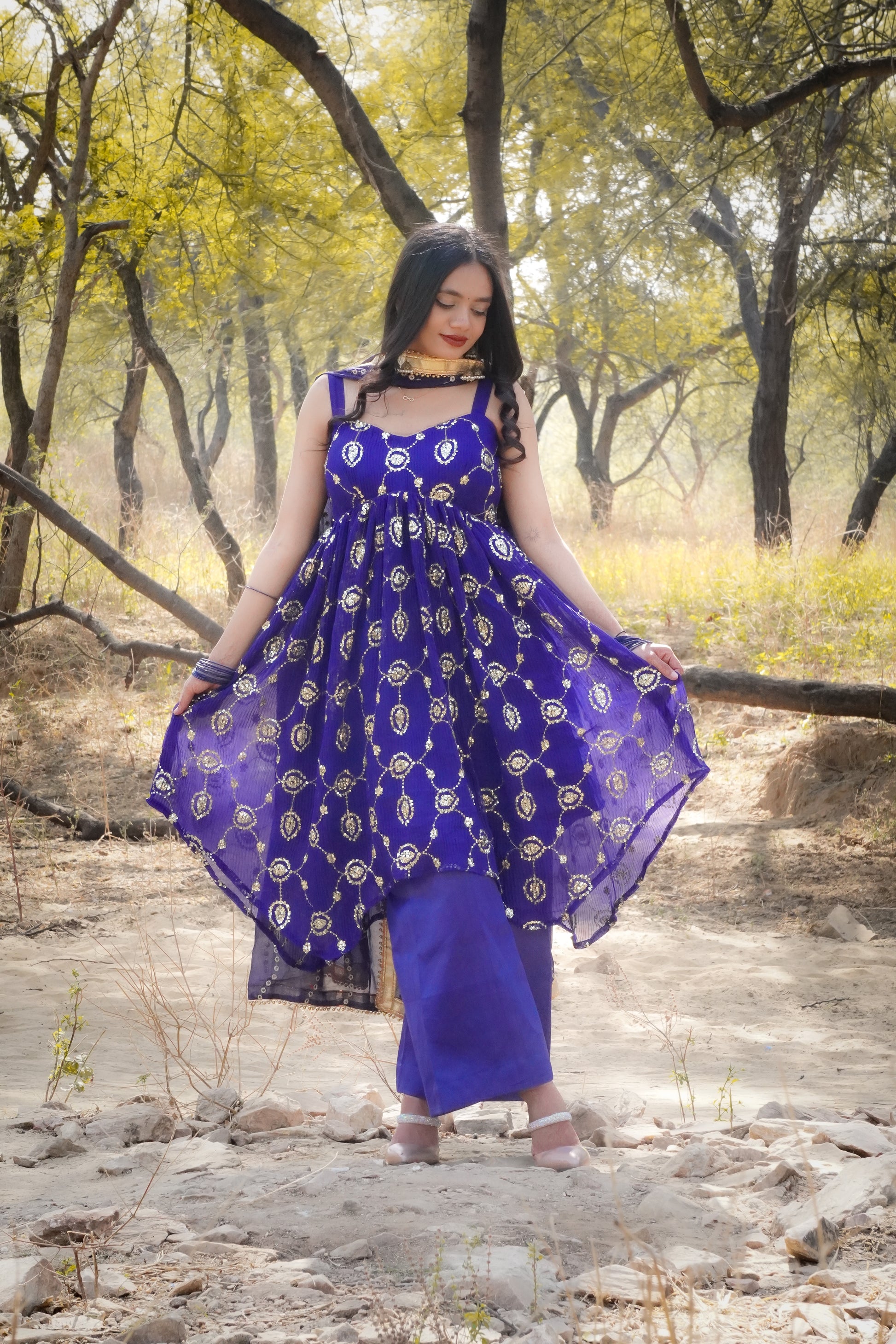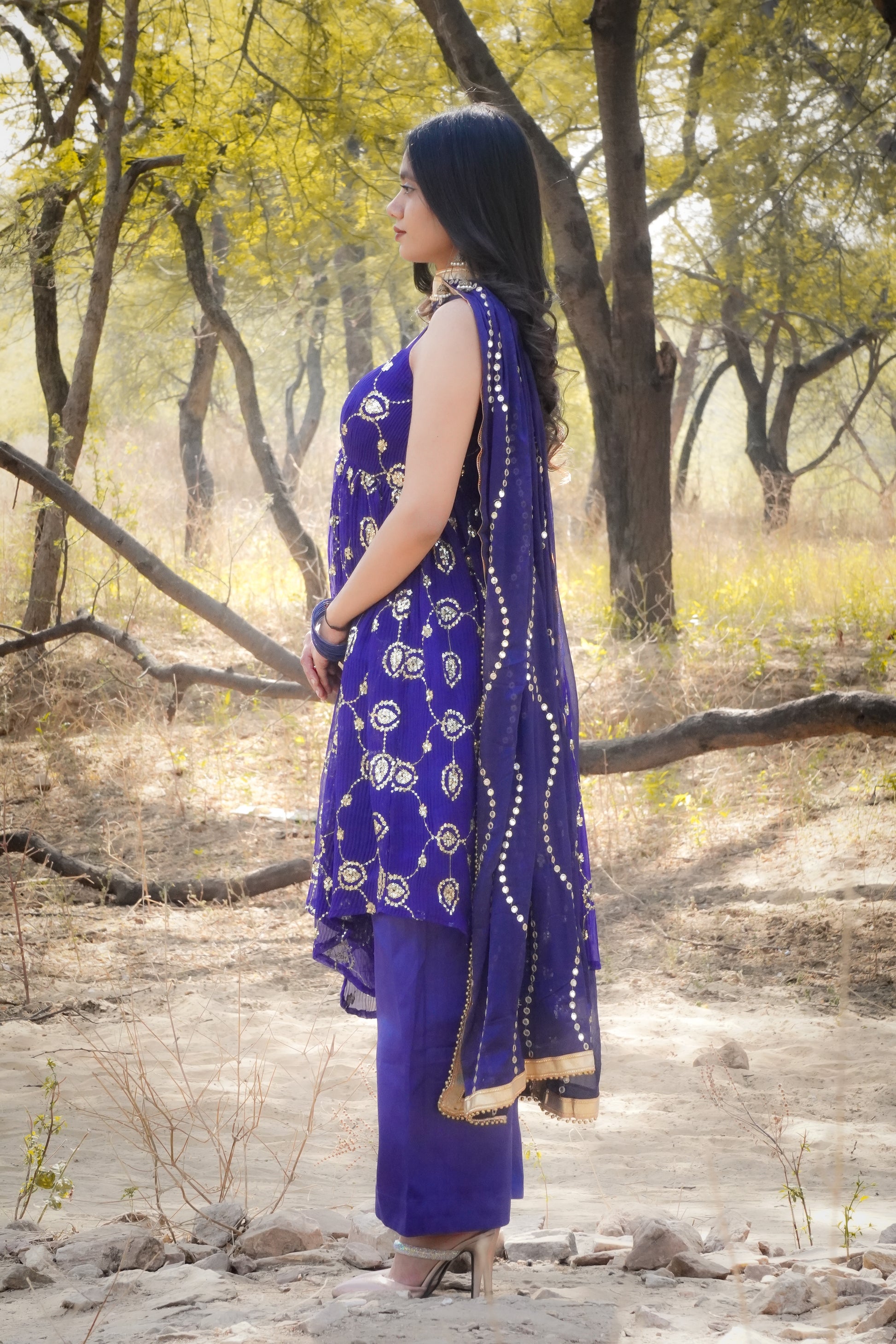 Make a statement of timeless grace with दिशा's Royal Blue Up and Down Kurti Set — an ensemble that’s all about regal charm with a modern twist. Crafted from flowy crushed georgette, the up and down kurti features a stunning sweetheart neckline that beautifully frames the look, adding a soft yet royal elegance. Paired with Digjam fabric pants, this set brings structure and style together in the most flattering way. The showstopper? A heavily mirror-worked dupatta that sparkles with every step — the perfect cherry on top to elevate the entire outfit! Whether you're dressing up for a celebration or simply want to feel your best, this look guarantees compliments. Rich in color, rich in detail — this is your go-to set for a bold, beautiful, and breathtaking appearance.